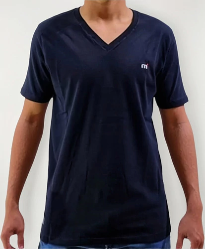 Remera escote en V, manga corta, con mini logo al frente, de jersey, diseño de la tela, liso.